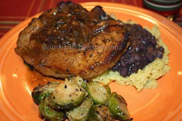 Heat remaining oil on medium high in a large sauté pan until almost smoking. Place the pork chops in the pan, one at a time, cooking until browned, about 3-4 minutes. Flip and continue to cook on other side for an additional 3-4 minutes. emove the pork chops to a plate and cover with foil. Then, in the same pan over medium heat, pour in the reserved marinade and let simmer 2-3 minutes. Slide the pork back into the pan and continue to cook another minute or so. After plating, spoon some of the onions and gravy over the top.