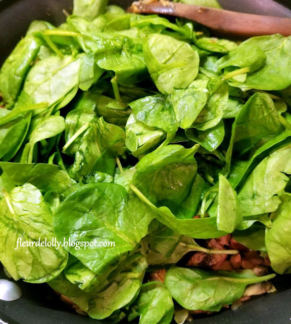 Now it's time for the spinach. Add a few handfuls at a time, allowing to wilt before adding a little more.