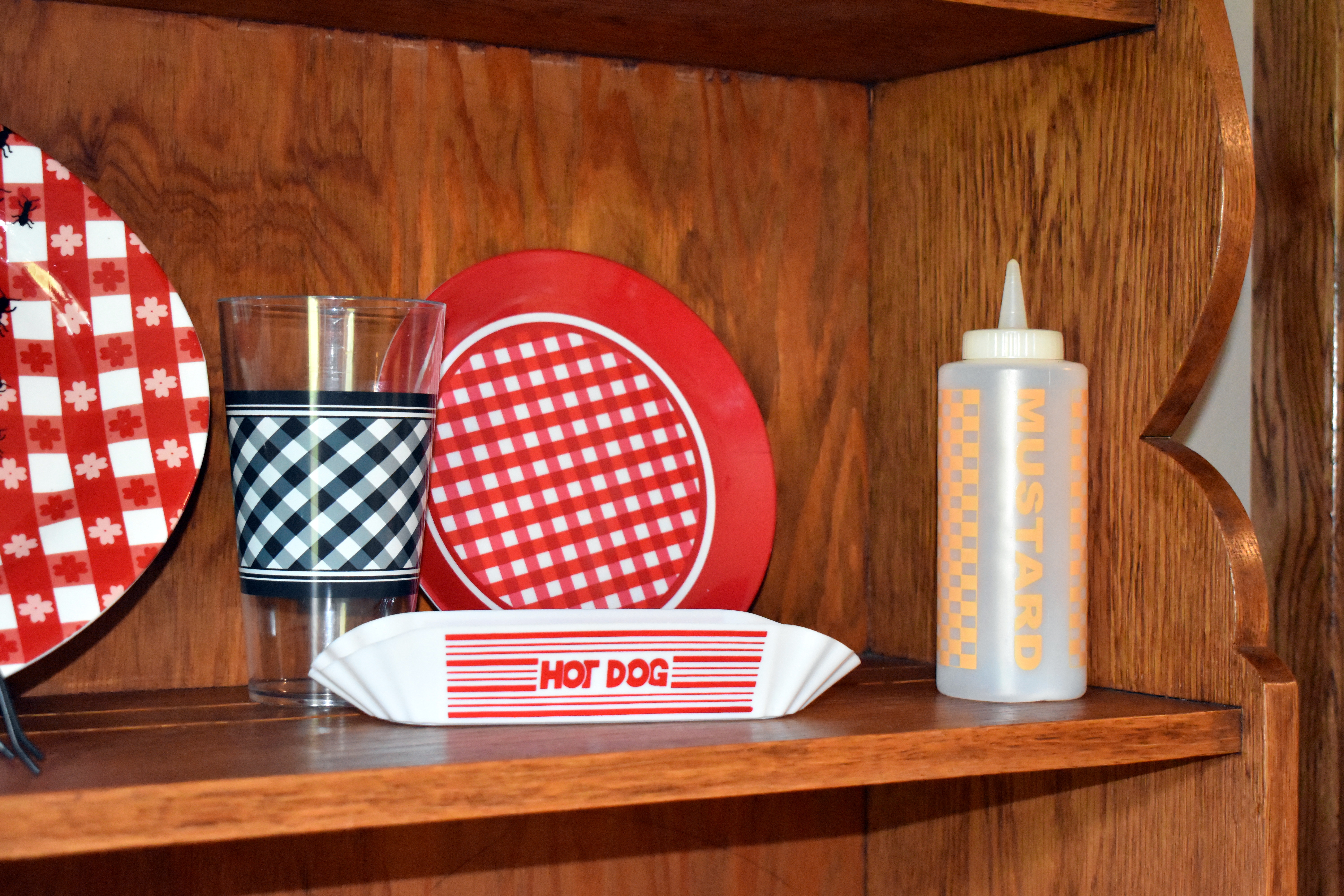 Here's a close up of the upper shelves showcasing these colorful ketchup and mustard dispensers. I can't miss an opportunity to use Fiestaware salt and pepper shakers.
